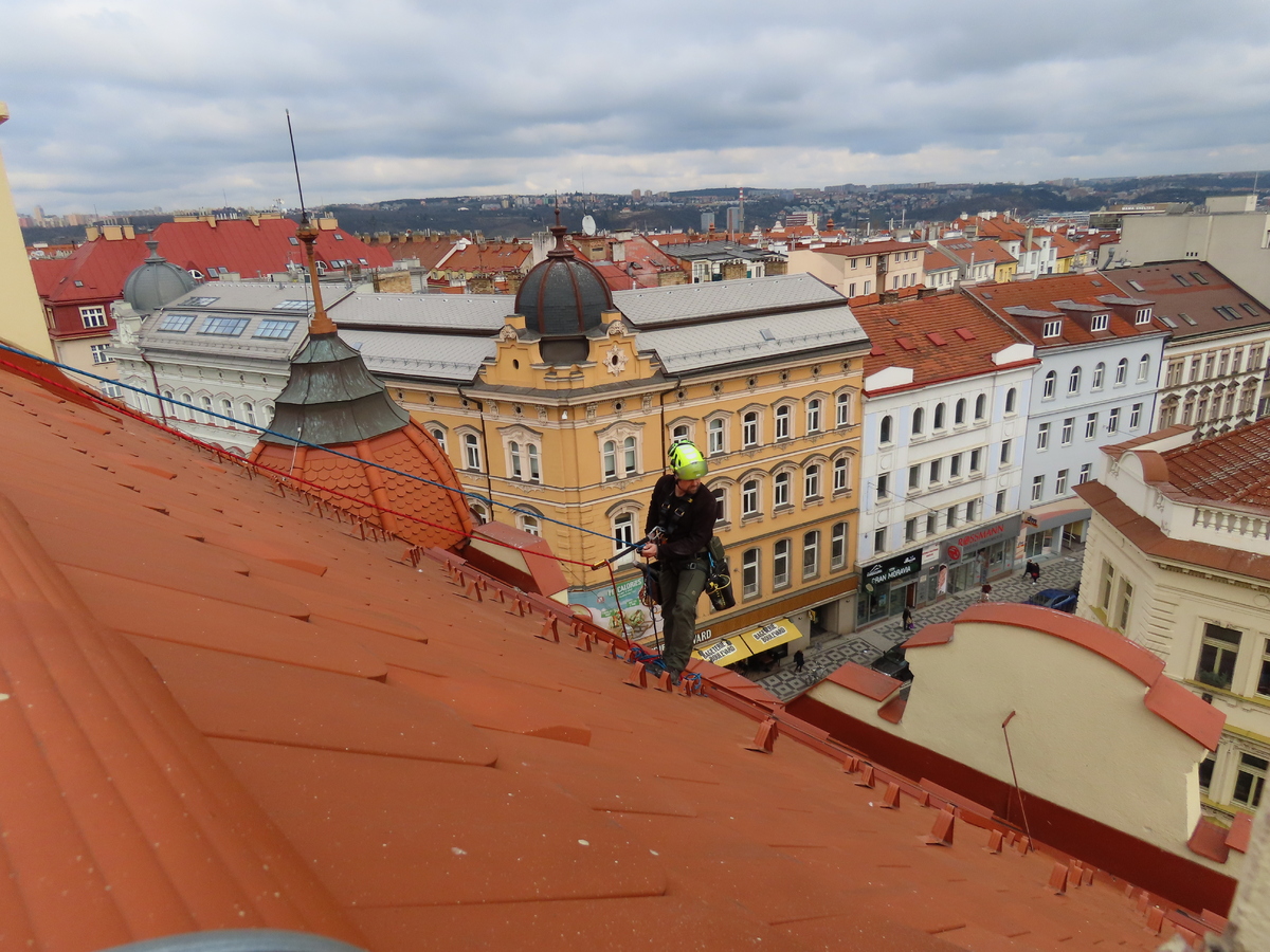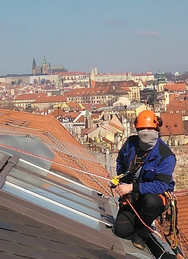 Mytí neotevíratelných střešních oken pomocí lanové techniky, nepřesně označované jako horolezecká.