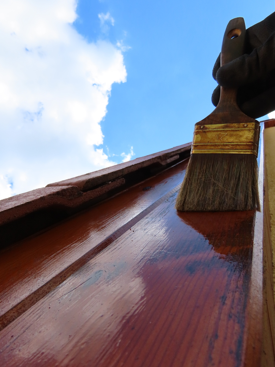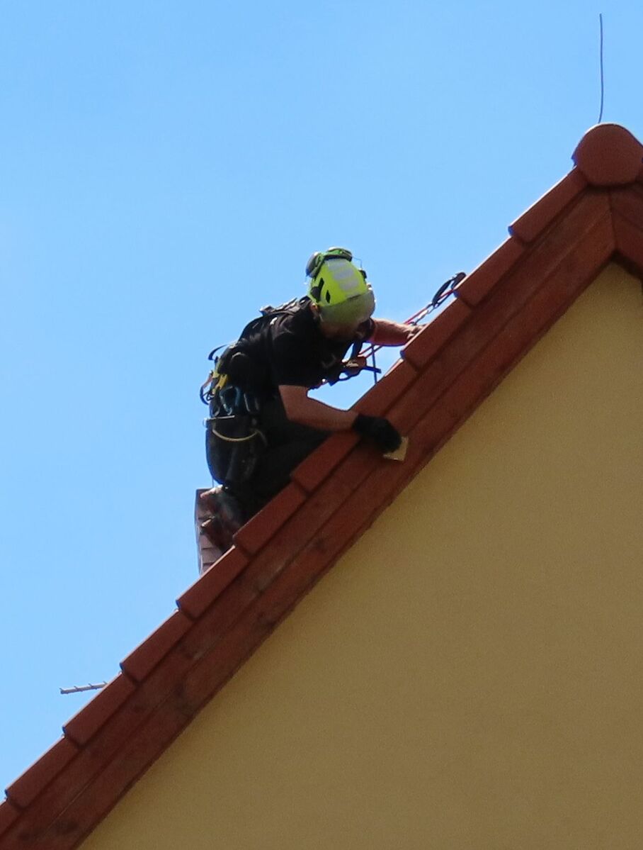 Nátěr dřevěného obložení štítu domu tzv. okřídlí pomocí lanové "horolezecké" techniky.