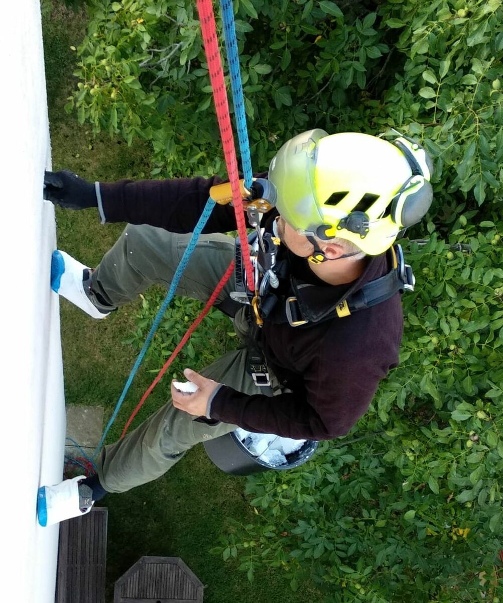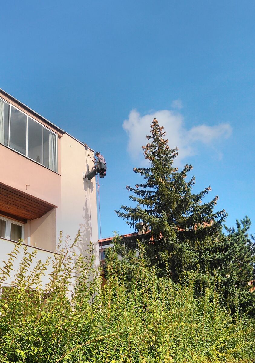 Vytváří je Strakapoud velký Dendrocopos major. Oprava děr v zateplení pomocí lanové "horolezecké" techniky.